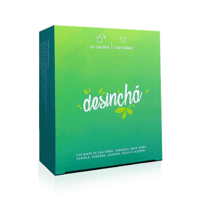 O Desinchá é um chá que tem como objetivo diminuir o inchaço do corpo, acelerar o metabolismo e trazer mais saúde para o seu dia a dia. Chá misto de Chá verde, Carqueja, Mate verde, Hortelã, Gengibre, Guaraná, Salvia e Alecrim.