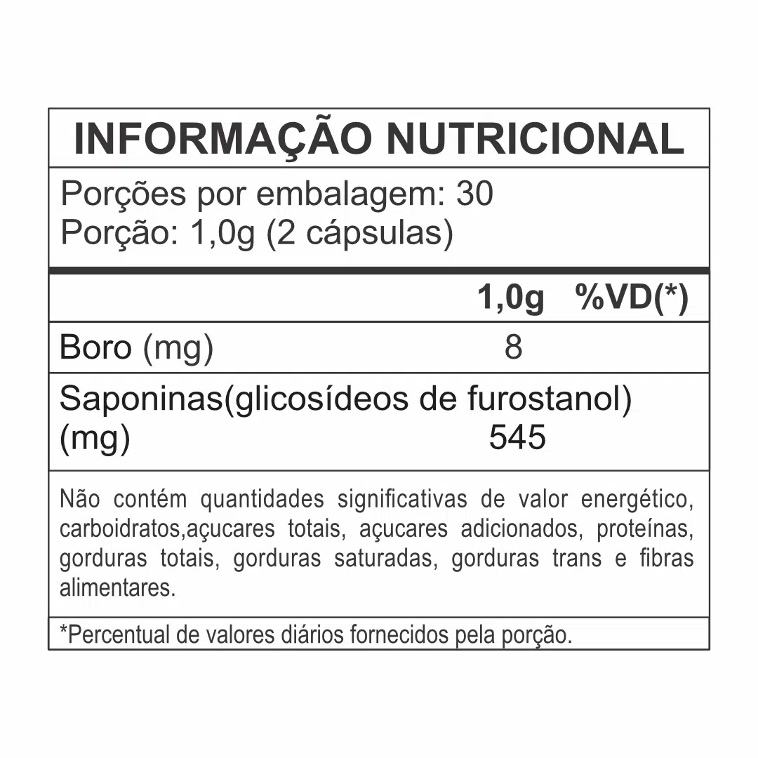 Feno Grego + Boro: Ajuda a regular os níveis de açúcar no sangue e também ajuda a perder peso; Estimula a produção e a regular os níveis de hormônio masculino, de forma natural; Auxilia na melhora da pele, como tem propriedades anti-inflamatórias e antioxidantes; Colabora na proteção de doenças cardiovasculares, por ser rico em fibras, ajudando a reduzir a absorção de gorduras da alimentação; Ajuda a reduzir as cólicas menstruais, dor de cabeça, cansaço, tonturas, etc, como as sementes contém propriedades anti-inflamatórias, como saponinas e as alcalóides.