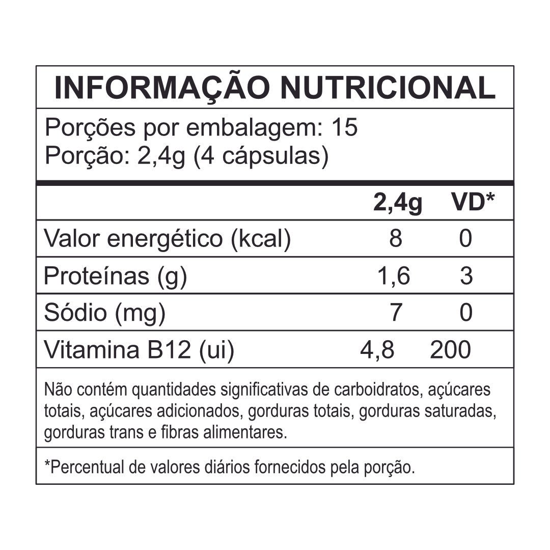 Ingredientes: Espirulina e cianocobalamina. Composição cápsula: gelatina. NÃO CONTÉM GLÚTEN.